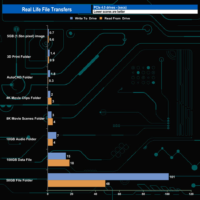To test real-life performance of a drive, we use a mix of folder/file types, and by using the FastCopy utility (which gives a time as well as MB/s result) we record the performance of the drive reading from & writing to a 2TB Kingston KC3000.