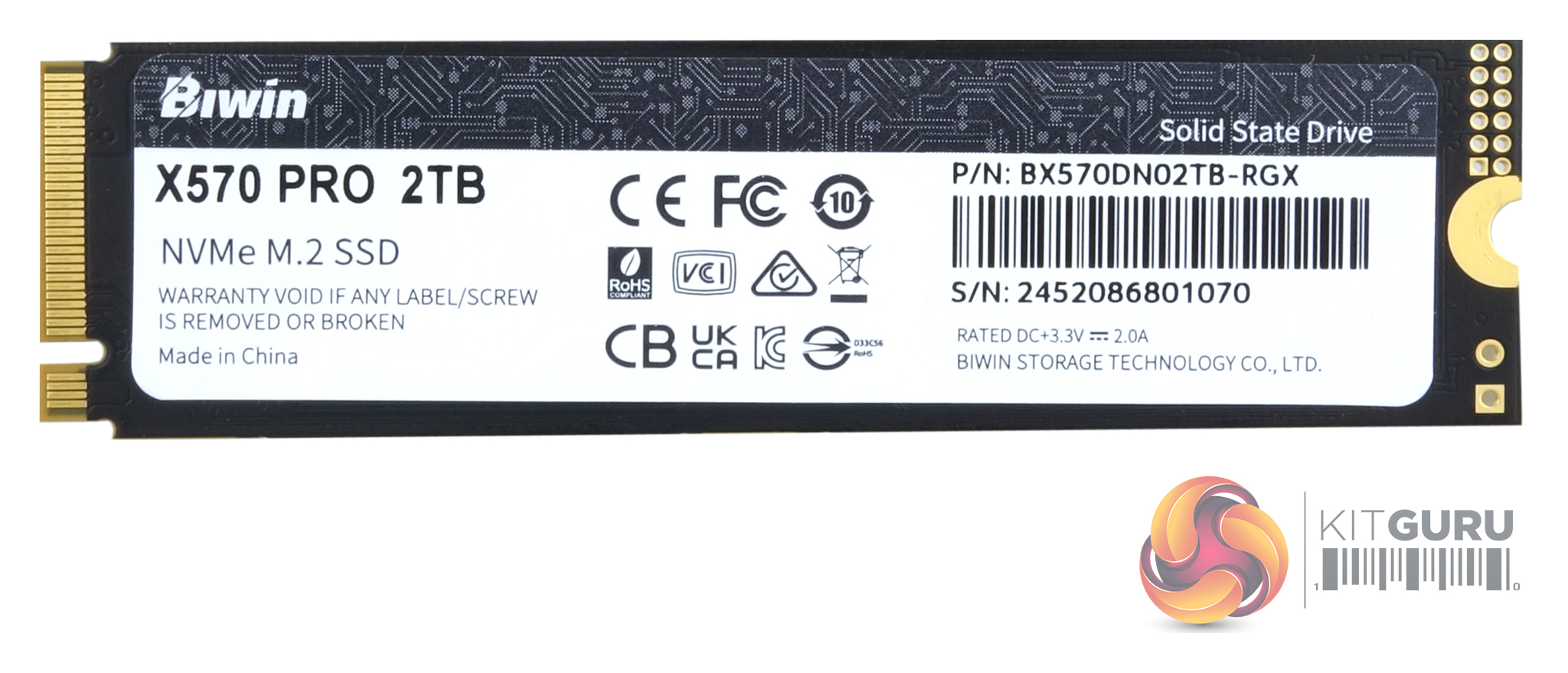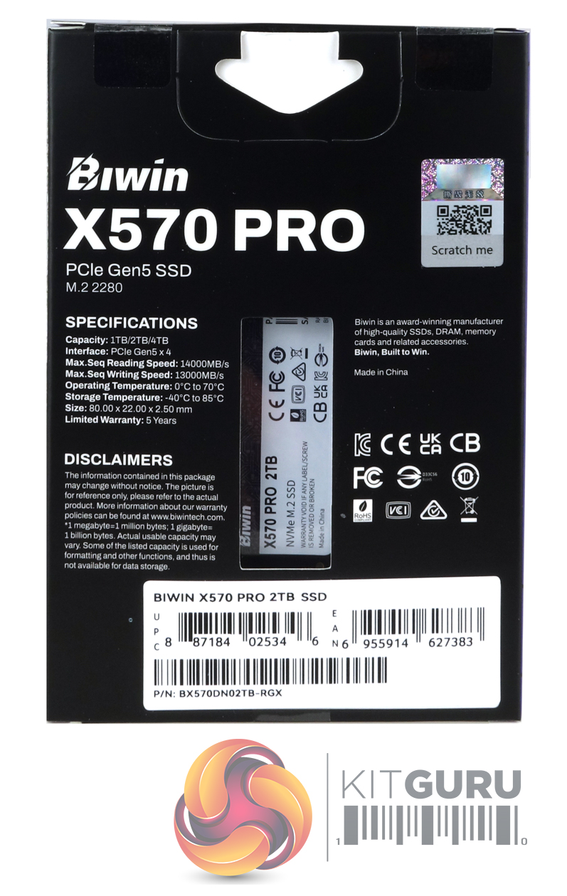 Like the 4TB X570 PRO, the 2TB model is built on a single-sided PCB (components on one side of the PCB). Sitting under the graphene thermal pad, which the front product label is fixed to, is the Silicon Motion’s SM2508 controller, two packages of 232-layer TLC NAND and a 2GB DRAM IC (the size of the DRAM is based on drive capacity at the ratio of 1GB per 1TB),