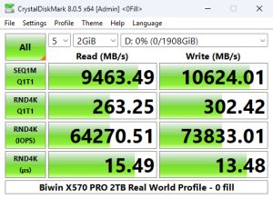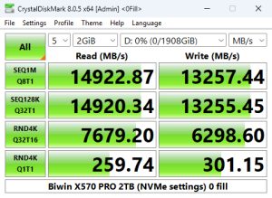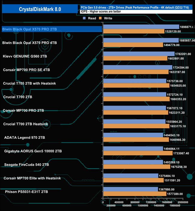 The 2TB X570 PRO is officially rated as up to 2000K IOPS for random reads and up to 1600K IOPS for random writes. Using the Peak Performance profile test of CrystalDiskMark 8 we couldn't quite get to those official maximums. The best read result we saw was 1,898,871 IOPS with the best write figure at 1,528,129 IOPS. Although we couldn't confirm the official figures, the random read result is the fastest we've seen to date for a consumer Gen 5 drive and both results are faster than what the 4TB drive produced.