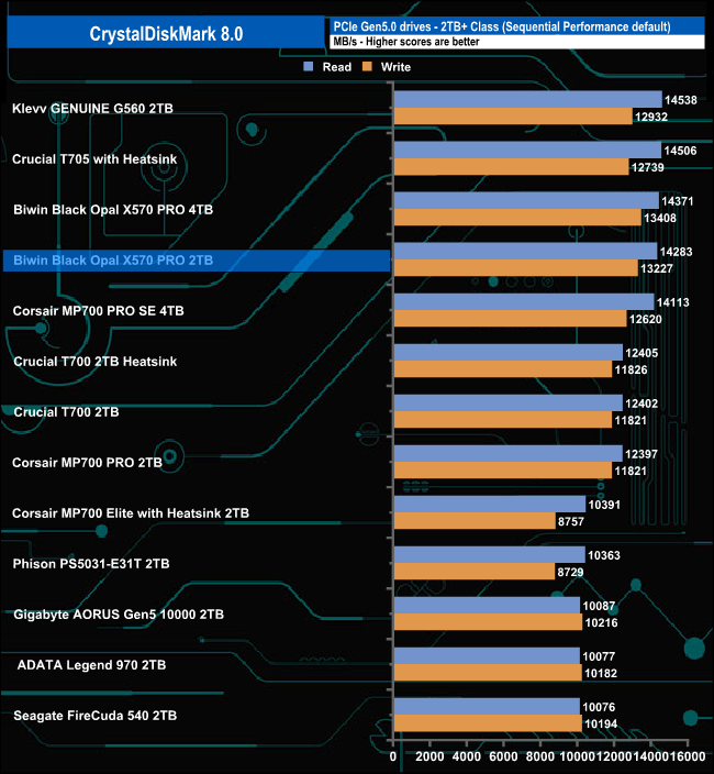 That 14,283MB/s read result places the 2TB X570 PRO in fourth place on the results chart just behind the 4TB version of the drive. It's read result is 88MB/s slower than its larger sibling while the 2TB write result is 181MB/s slower.