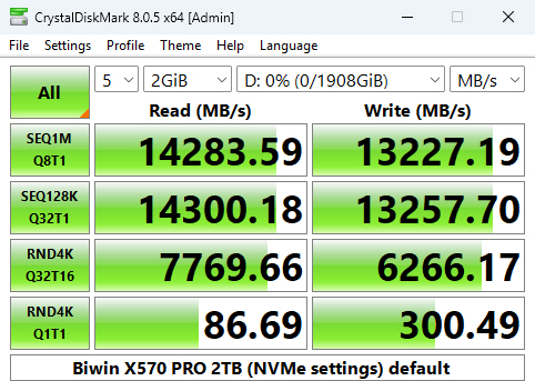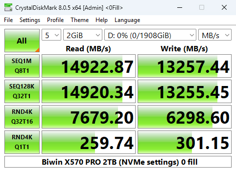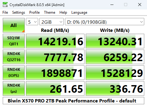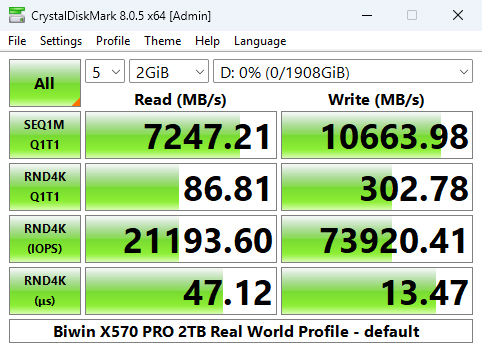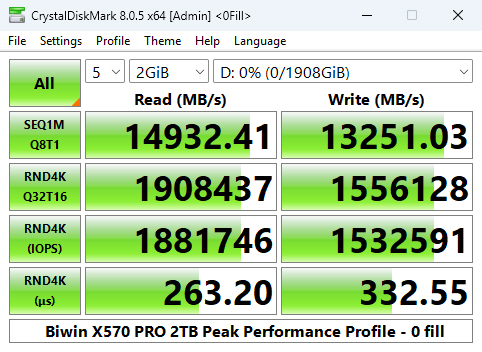 The 2TB X570 PRO is officially rated as up to 2000K IOPS for random reads and up to 1600K IOPS for random writes. Using the Peak Performance profile test of CrystalDiskMark 8 we couldn't quite get to those official maximums. The best read result we saw was 1,898,871 IOPS with the best write figure at 1,528,129 IOPS. Although we couldn't confirm the official figures, the random read result is the fastest we've seen to date for a consumer Gen 5 drive and both results are faster than what the 4TB drive produced.