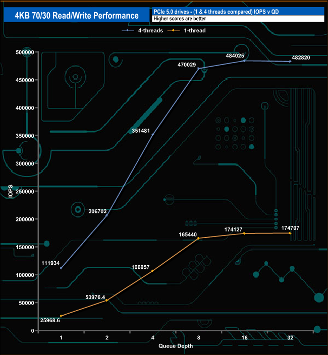We used CrystalDiskMark 8’s custom settings to test the 4K 70/30 mixed read/write performance of the drive through a range of queue depths using a single thread and four threads.