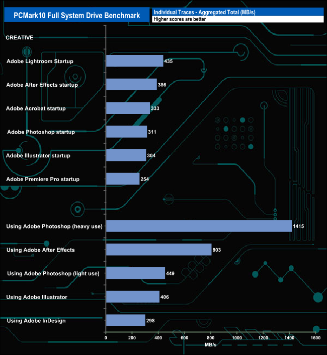 When tested with the Adobe usage traces the X570 PRO averaged 674.2MB/s for the five tests, which includes the 1,415MB/s result for the Adobe Photoshop heavy usage trace. The slowest of the five traces was the InDesign trace at 298MB/s