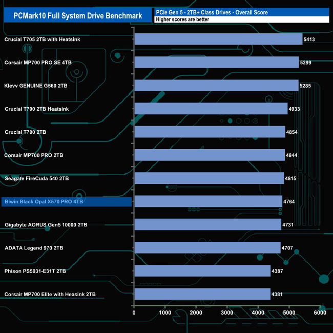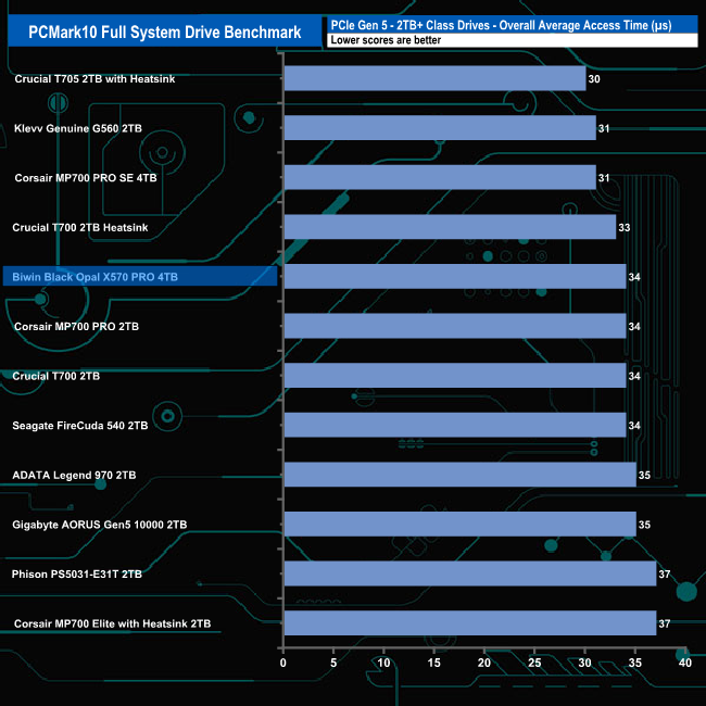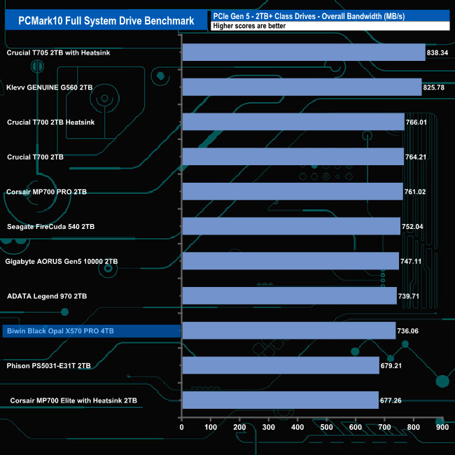 With an overall bandwidth figure of 736MB/s, the X570 PRO sits in third from last position in the results table but there is only a 102MB/s gap between it and the heatsink version of the Crucial T705 which tops the table.