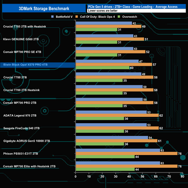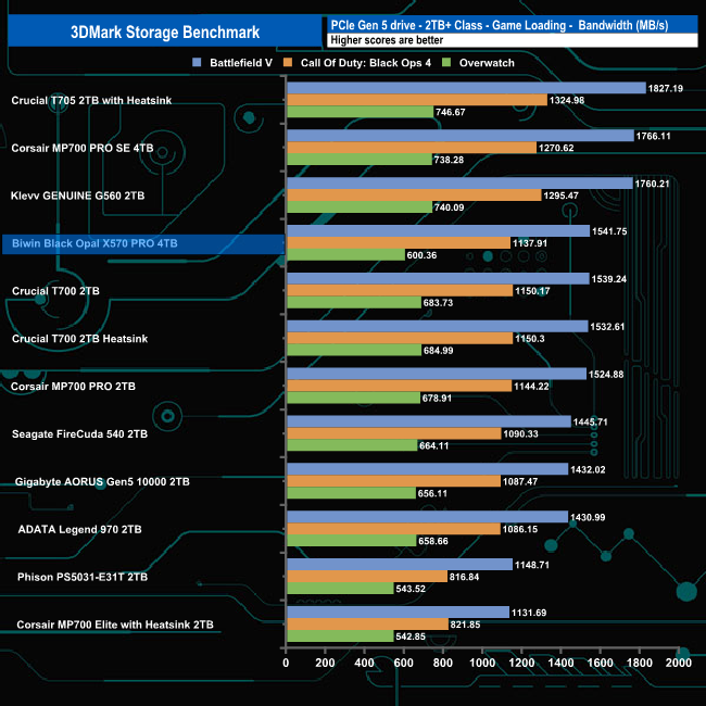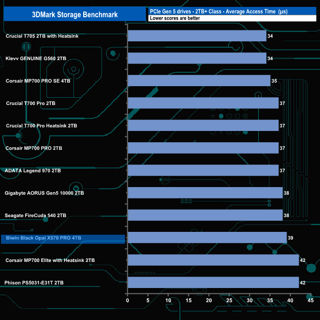 In 3DMark’s Storage Test, the drive had an average game loading bandwidth figure for the three games of 1,093MB/s (good enough for fourth place in the results table), with an average access time figure of 48µs (0.048m/s).