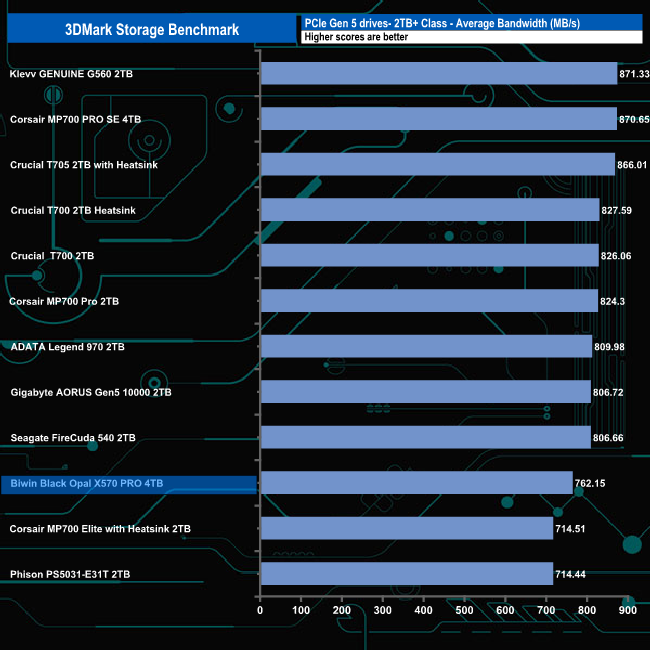 The average bandwidth figure for the 4TB X570 PRO for the complete benchmark run was 762.15MB/s, a result which sees the drive sitting close the the bottom of the results chart.