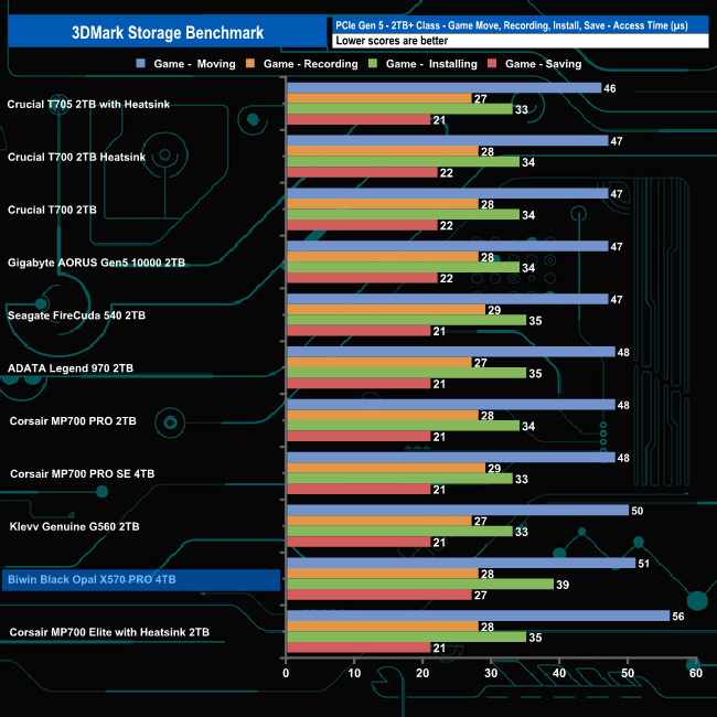 In the game moving, recording, installing and saving test traces the drive averaged 1,489.04MB/s with an average access time of 29µs (0.029m/s) for the four tests which see the drive in the penultimate spot in the table.