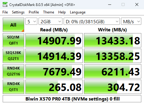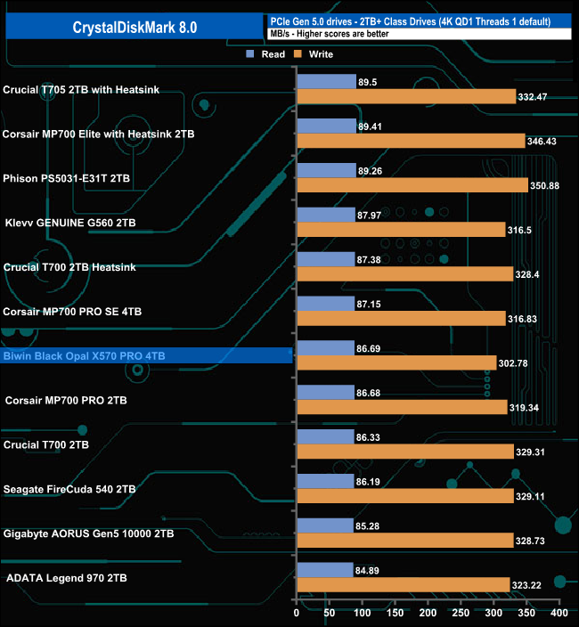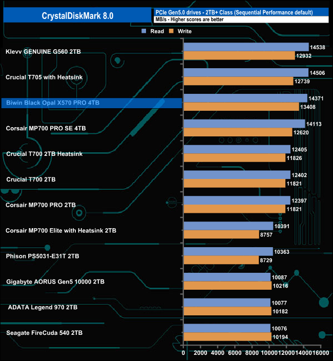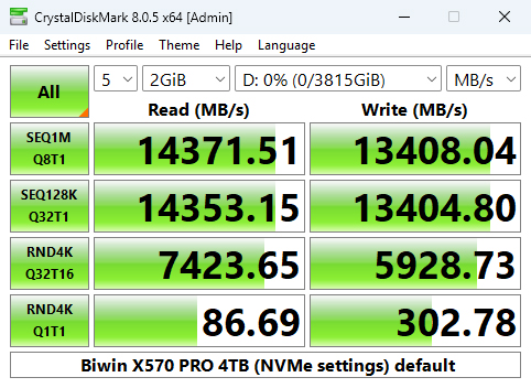That 14,371.51MB/s read result places the 4TB X570 PRO in third place on the results chart. However, its write result of 13,408.04MB/s is the fastest we've seen for a Gen5 consumer drive to date.
