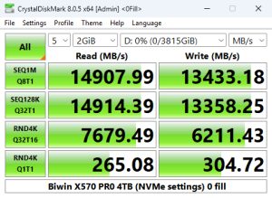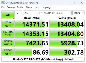 As can seen from the benchmarking screens we can confirm the official sequential ratings of the drive of up to 14,000MB/s for reads and up to 13,000MB/s for writes and even better them with default test figures of 14,371.51MB/s for reads and 13,408.04MB/s for writes.