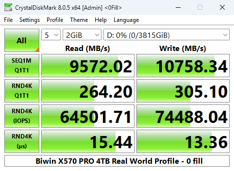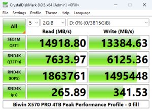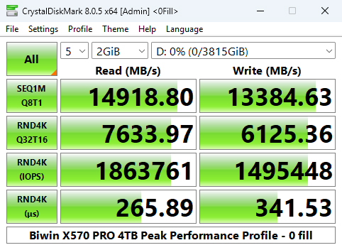 The 4TB X570 PRO is officially rated as up to 2000K IOPS for random reads and up to 1600K IOPS for random writes. Using the Peak Performance profile test of CrystalDiskMark 8 we couldn't quite get to those official maximums. The best read result we saw was 1,885,857 IOPS with the best write figure at 1,494,779 IOPS. Although we couldn't confirm the official figures, the random read result is the fastest we've seen to date for a consumer Gen 5 drive.