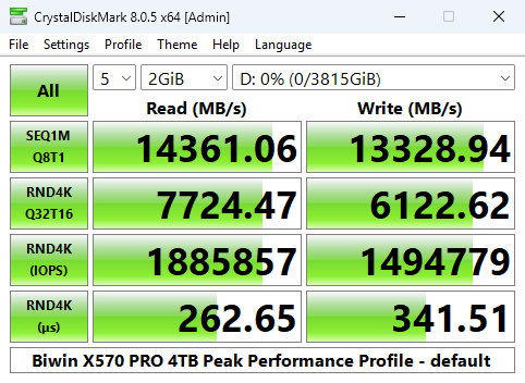 Once again we could confirm the official sequential figures with Peak Performance profile test results of 14,361MB/s for reads and 13,328MB/s for writes.