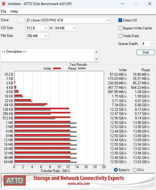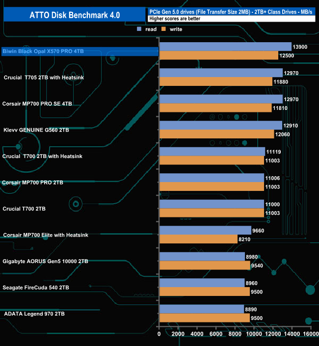 Using the ATTO benchmark we couldn't hit the official read and write sequential figures of up to 14,000MB/s and 13,00MB/s for read and writes respectively but with test figures of 13,900MB/s for reads and 12,500MB/s for writes, we got close. Those result figures may be shy of the official maximums but they are good enough to put the drive in top spot on the results chart.