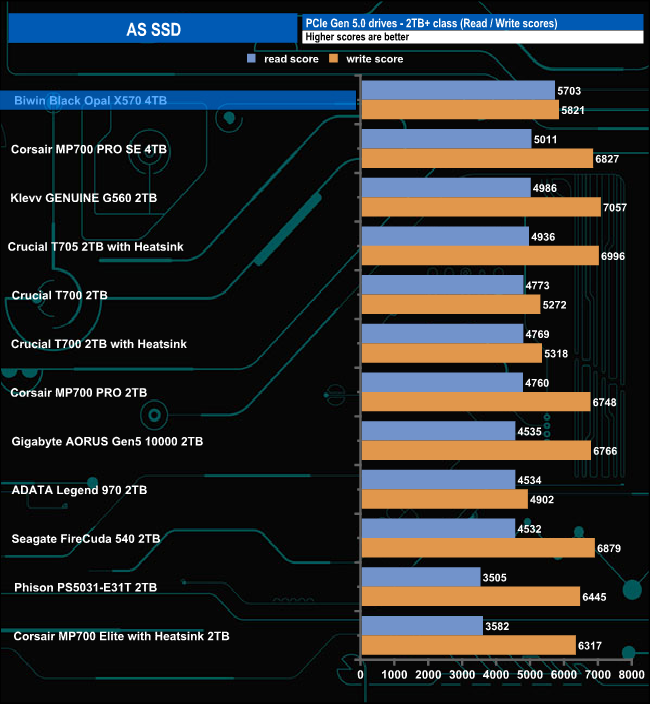 The X570 PRO's read score of 5703 in the AS SSD benchmark sees it in first place in the results table by some distance from the next best, Corsair's MP700 PRO SE drive. However, its write score of 5821 isn't anywhere near as impressive.