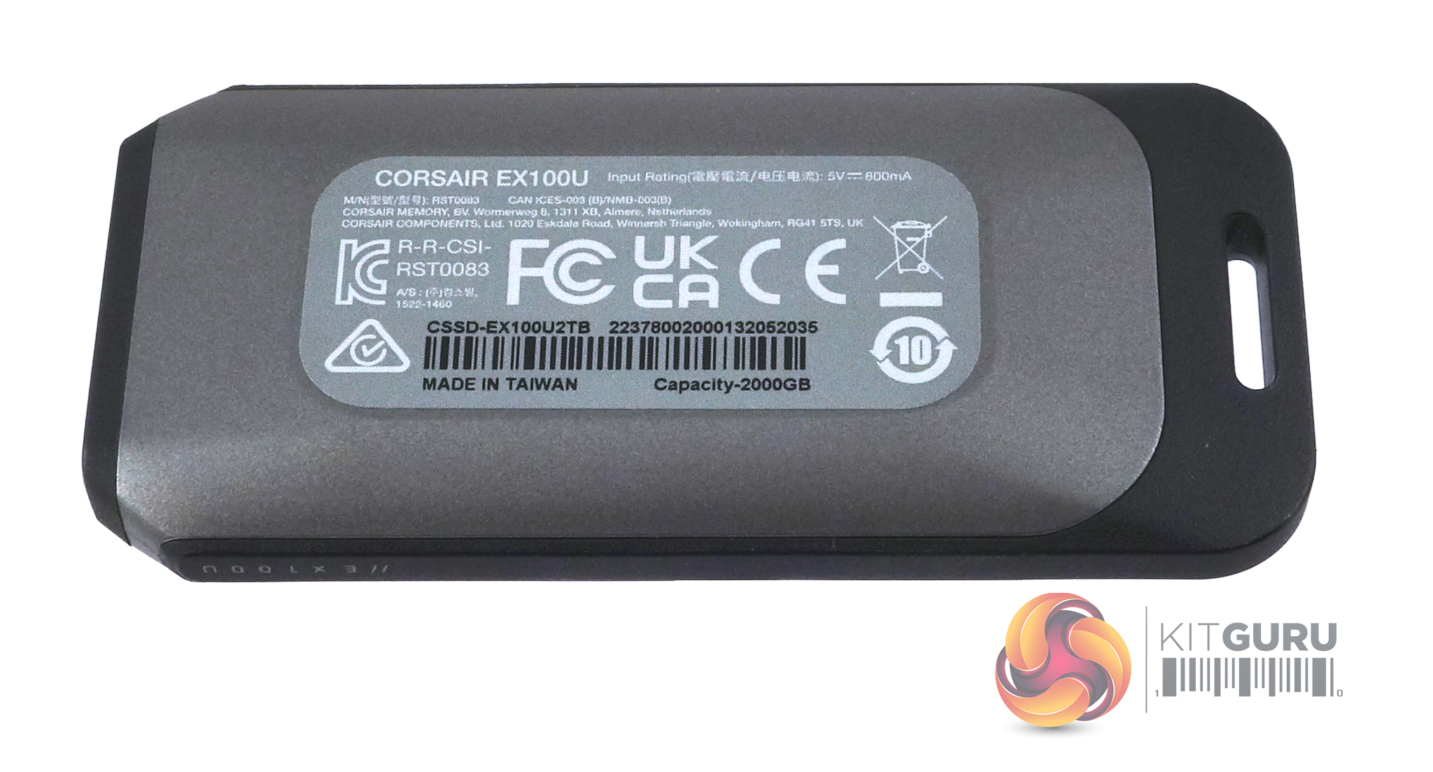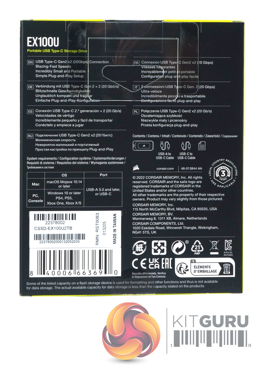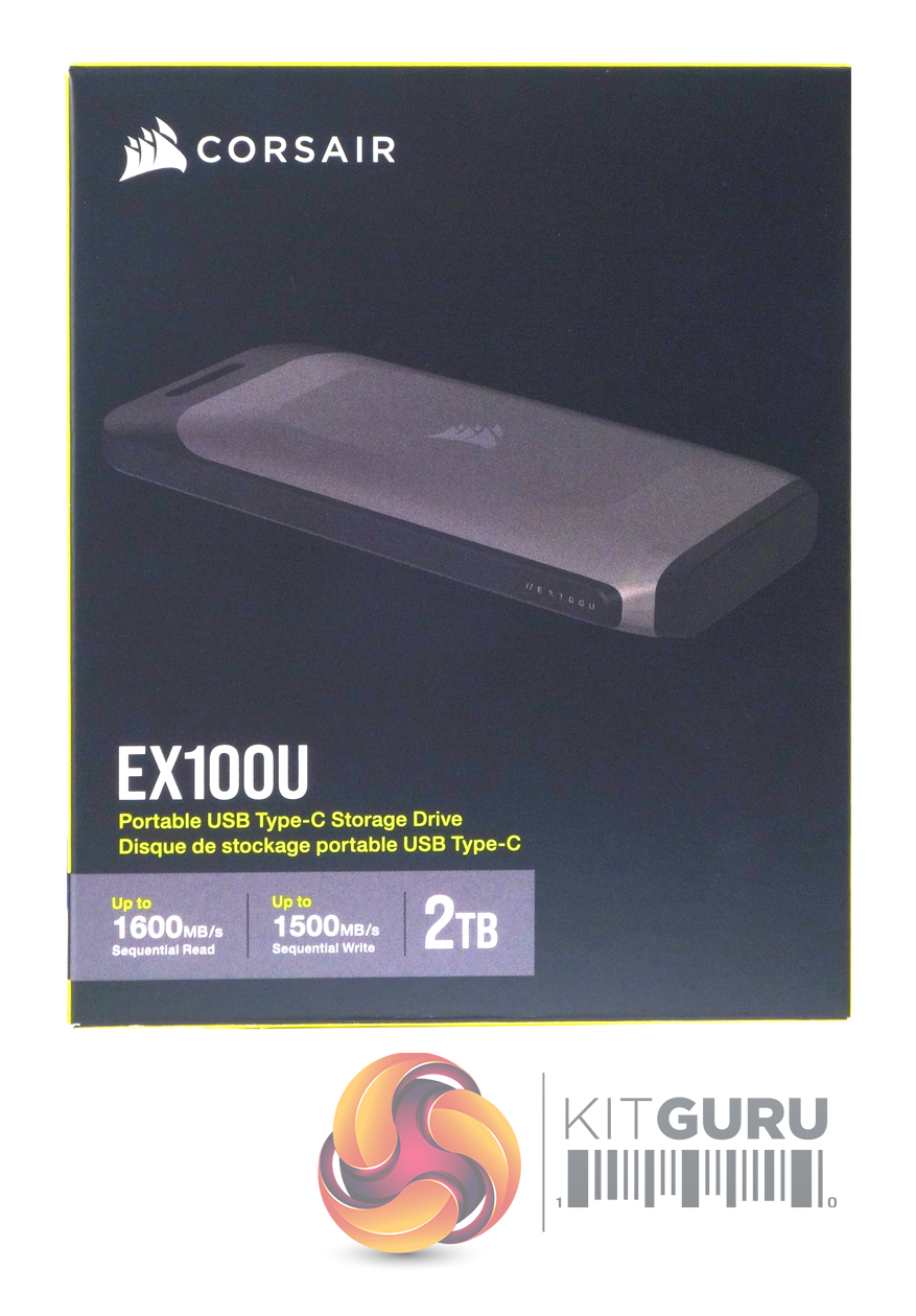 The EX100U comes in the customary Corsair yellow and black finished box. On the front of the box is an image of the drive under which are the headline Sequential read and write speeds (up 1,600MB/s reads, up to 1,500MB/s writes). Next to these is the capacity of the drive. The rear of the box has a multilingual description of the drive under which is a systems requirements box which lists the OS supported by the drive (Windows 10 or later, PS4, PS5, Xbox One Xbox X/S and macOS Mojave 10.4 or later). There is also a small diagram displaying what's in the box.