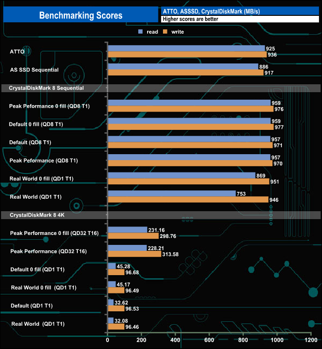 Switching over to the CrystalDiskMark 8 benchmark, the fastest read performance was 959MB/s, which came from the default and default 0 fill tests. The best write result, 977MB/s, came from the default 0 fill test. The fastest 4K read performance came from the Peak Performance 0 fill test (QD32T16) at 231.16MB/s. The fastest write result came from the default Peak Performance test at 313.58MB/s. More everyday figures came from the Real World test at 45.17MB/s (0 fill, QD1, T1) for reads and 96.49MB/s for writes using the same benchmark.