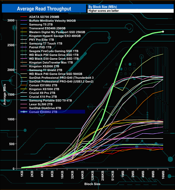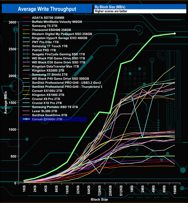 In our read throughput test, the drive peaked at the end of the test at 2,769.27MB/s, well short of the official maximum of 4,000MB/s but as you can see from the comparison graph. When it comes to read performance, the EX400U is the fastest USB-interfaced drive we've tested to date by quite a margin.