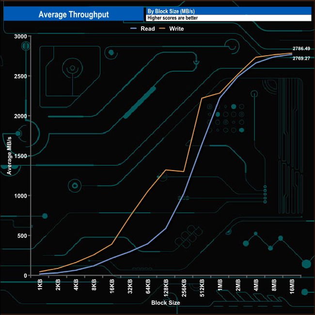 As with the read throughput test, the drive's performance in the write throughput test saw it peak at the end of the test run at 2,786.49MB/s once again short of the maximum official figure of 3,600MB/s. As with the read test, the 2,786MB result may be short of the official figure, but it's the fastest we've seen to date for a USB drive.
