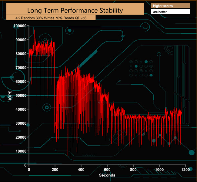 For the long term performance stability test, we set the drive up to run a 20-minute 4K random test with a 30% write, 70% read split, at a Queue Depth of 256 over the entire disk. The 480GB Corsair Force MP500 averaged 49,351 IOPS for the test with a performance stability of 55.6%.