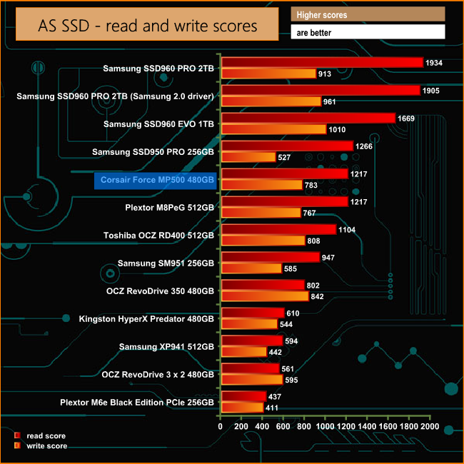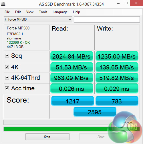 Here again, the MP500 falls below both the latest Samsung SSD960 and the previous generation SSD950 drives in the ASSSD read scores. While it still lags behind the two SSD960 drive's write scores it outperforms the SSD950 when it comes to write performance. At 963.09MB/s, the read performance of the drive at a fairly deep queue depth of 64 is impressive.