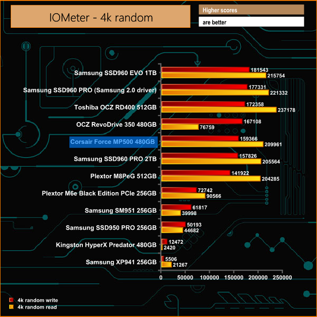 Benchmarked using our test settings with IOMeter, the drive fell way short of the official 250,000 IOPS for reads and 210,000 IOPS for writes at 209,961 IOPS and 159,366 IOPS for read and writes respectively. However, these results are better than the results for the Samsung SSD960 PRO drive using the same default Windows driver.