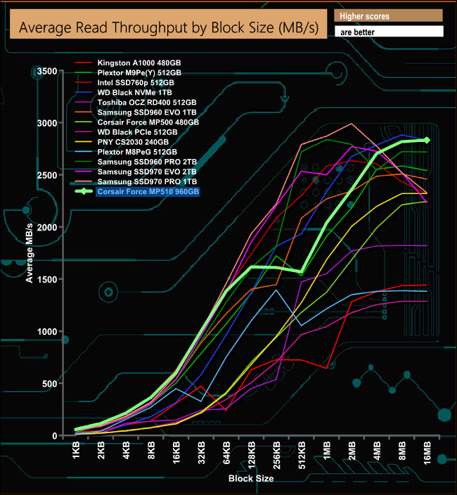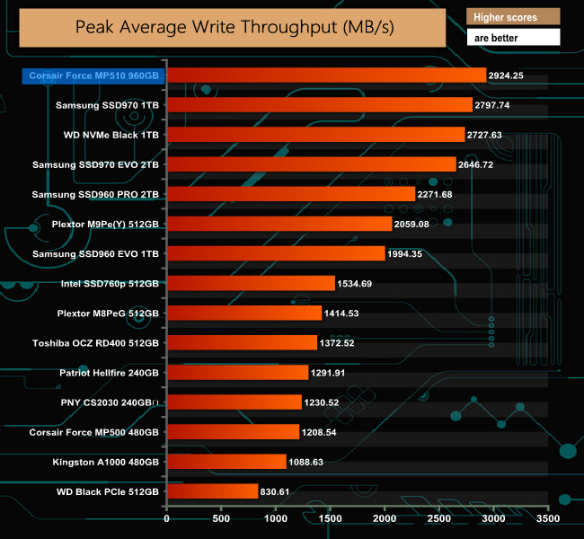 In our read throughput test, the drive's performance at the 512KB block mark faltered but it soon recovered to finish the test at a peak of 2,244.51MB/s. The smoothness of the write performance test is only interrupted by the slight loss in performance at the 2MB block mark where the drive drops from 2,735MB/s to 2,735MB/s, but as with the read throughput test the drive recovers quickly to peak at the end of the test at 2,924.25MB/s.