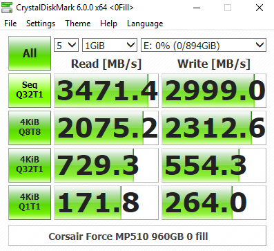 In the CrystalDiskMark benchmark, the MP510 sits firmly in the middle of the pack in the 4K test at a queue depth of 1, but even here the write performance is very impressive – in fact, its score of 264MB/s is the fastest write result we have seen to date for a consumer drive. However, deepening the queue depth sees the drive climb through the chart in to second place. There's a marked improvement in 4K read performance at lower queue depths when switching to the highly compressible data of CrystalDiskMark's 0 fill test.
