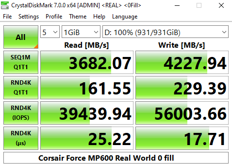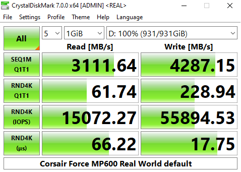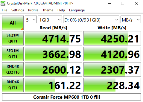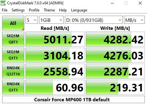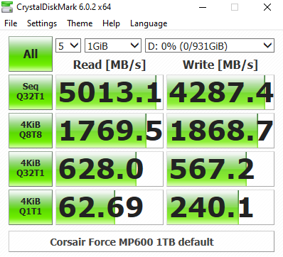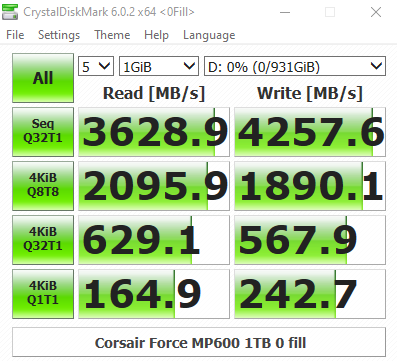 In CrystalDiskMark's QD32 test, the Corsair Force MP600 makes it into the top 5 fastest 1TB consumer drives we have tested to date, but it's not as fast as the other Gen4 drive we've tested, Patriot's Viper VP4100.