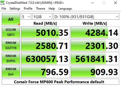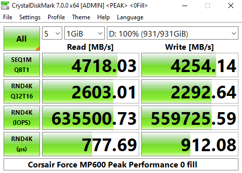 Looking at the Peak Performance results for Sequential read/write performance we see that it confirms the official figures for the Force MP600 of 4.950MB/s and 4,250MB/s respectively.