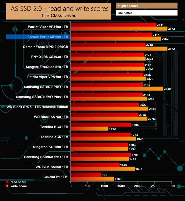 In the ASSSD results chart, the Force MP600 slips into second place behind the other Gen4 drive we have tested, the Patriot Viper VP4100.