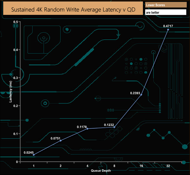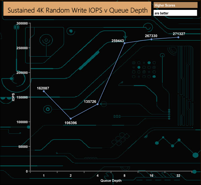 The drive performs solidly at QD1 (162,087 IOPS) before dropping sharply at QD2 (106,396 IOPS) but it recovers pretty well so that by the time the test finishes at QD32, the performance has risen to 271,327 IOPS.