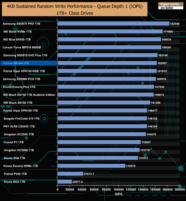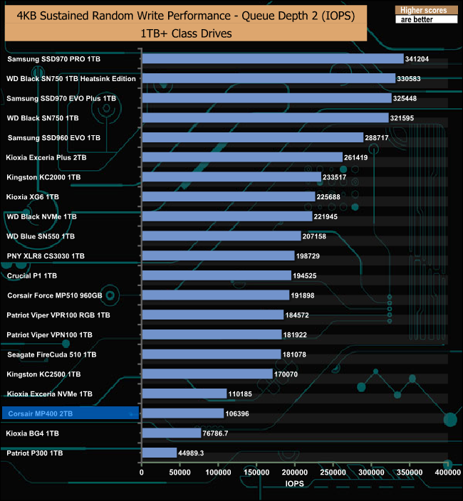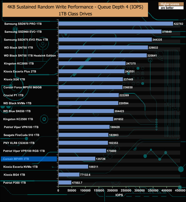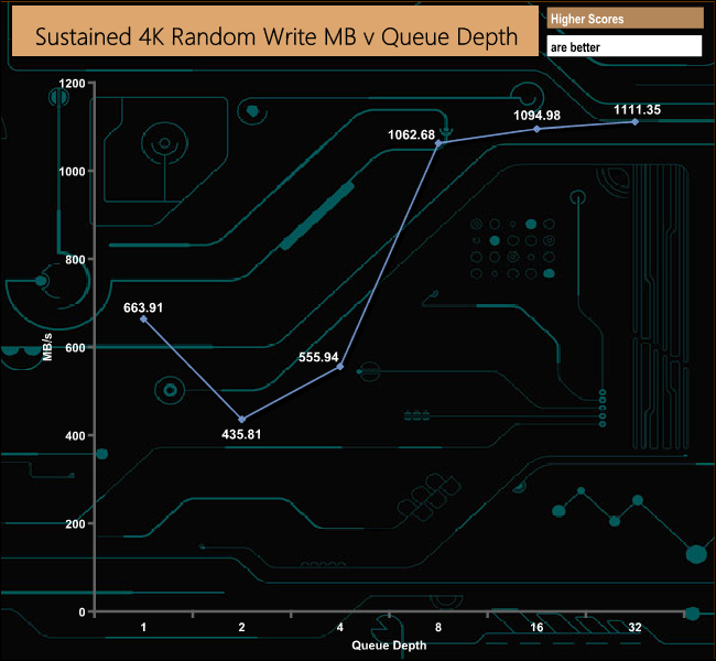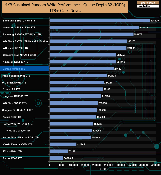 The MP400 performs better in our 4-threaded 4K random write test than it does with the read tests although the best result of 271,327 IOPS (QD32) is still way off the official maximum of 560,000 IOPS. As with the read tests, we did a quick test of the drive using 8 threads at QD32 which yielded a figure of 493,280 IOPS, much improved, but still way short of the official figure.