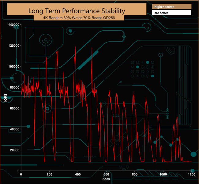For the long term performance stability test, we set the drive up to run a 20-minute 4K random test with a 30% write, 70% read split, at a Queue Depth of 256 over the entire disk. The 2TB MP400 averaged 47,504 IOPS for the test with a performance stability of 44%.