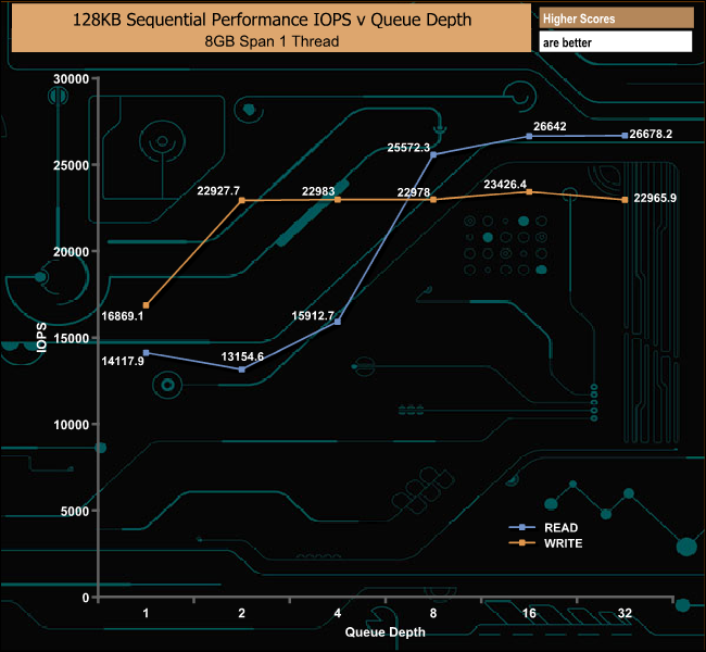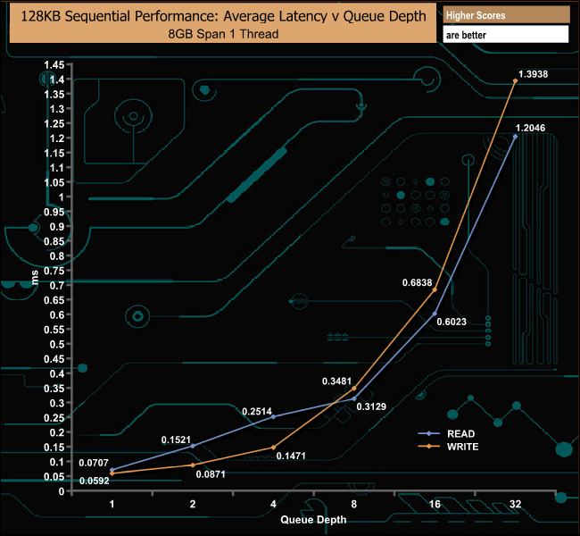 At a queue depth of 1, the MP400 is the fastest drive in this category we have tested to date when it comes to Sequential writes. However, as the queue depth deepens the performance drops back down the tables.