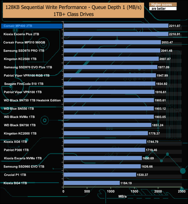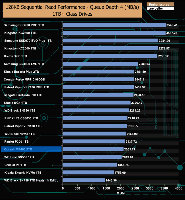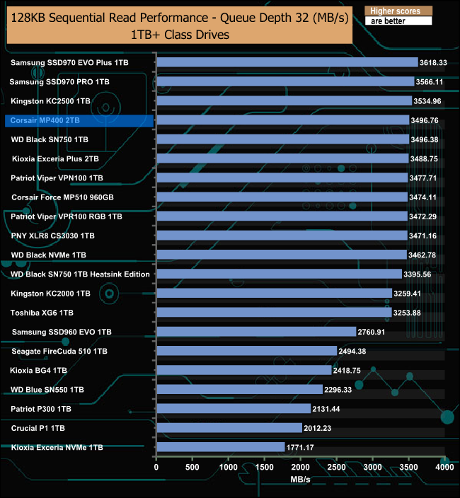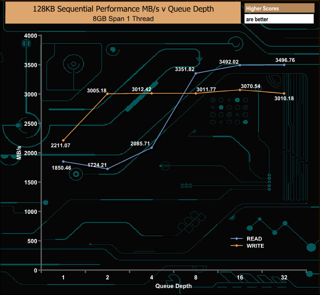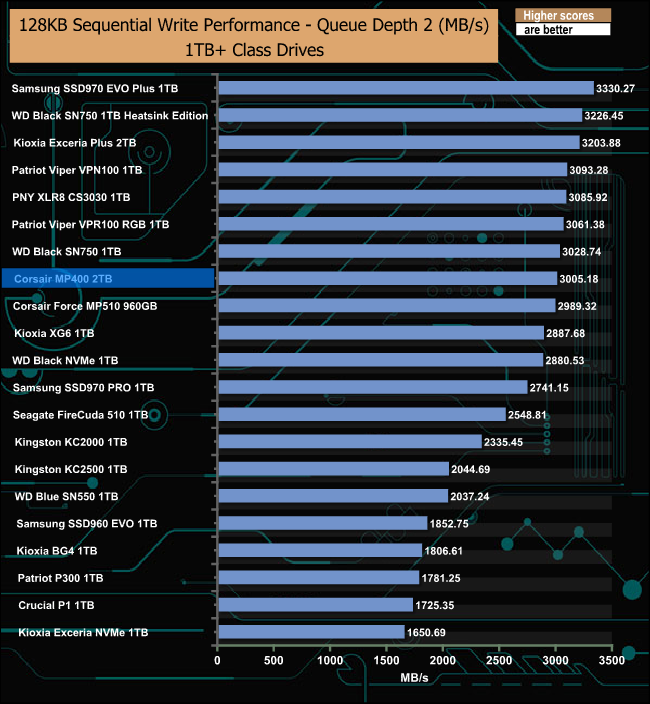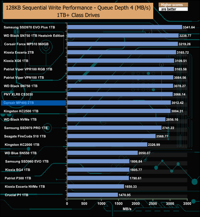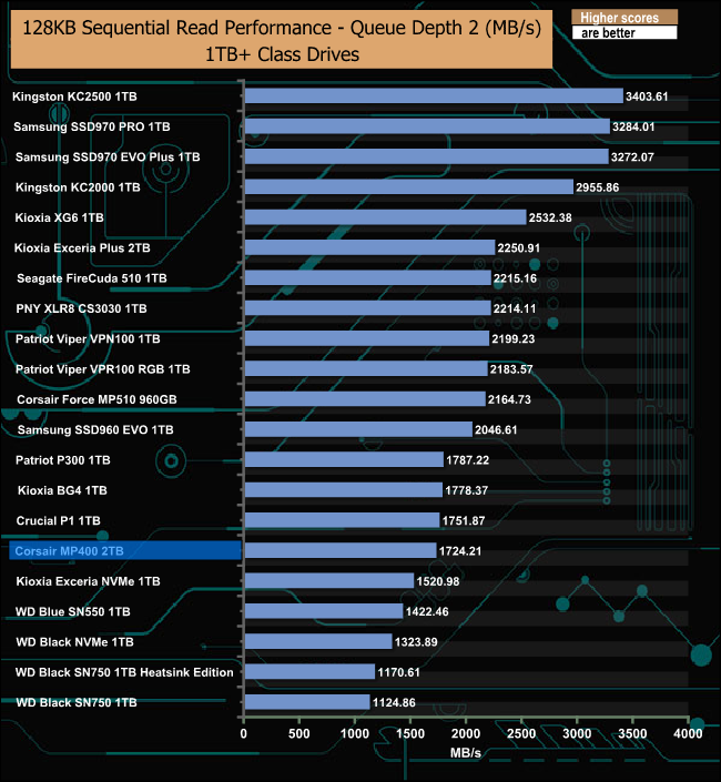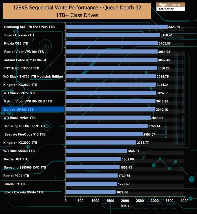 The MP400 sits in the lower part of the results charts through queue depths 1 to 4 but at a queue depth of 32, it climbs to fourth place in the charts with its 3,496.76MB/s result.