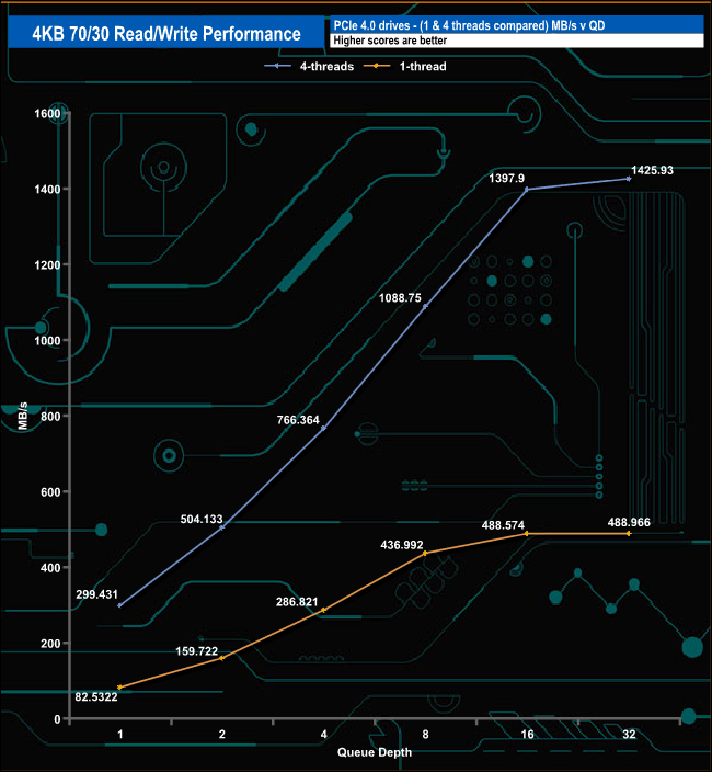 We used CrystalDiskMark 8’s custom settings to test the 4K 70/30 mixed read/write performance of the drive through a range of queue depths using a single thread and four threads.