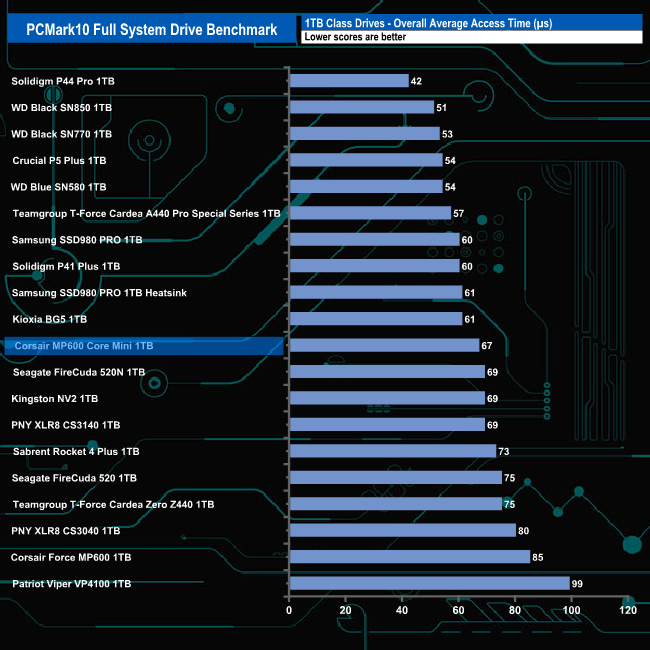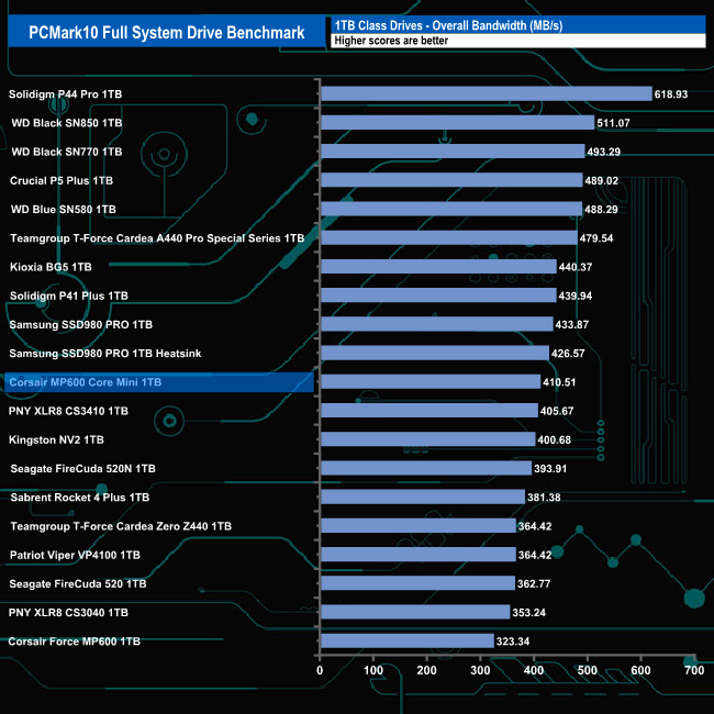 The overall bandwidth figure of 410.51MB/s sees the 1TB Corsair MP600 Core Mini sitting in a lower mid-table position.
