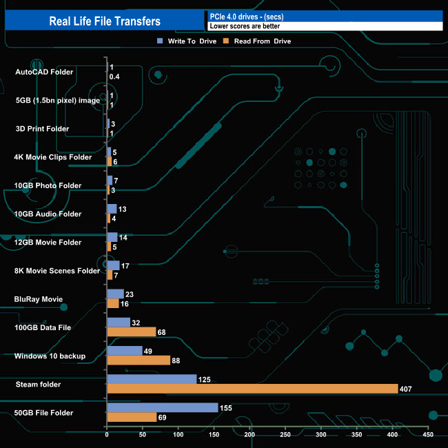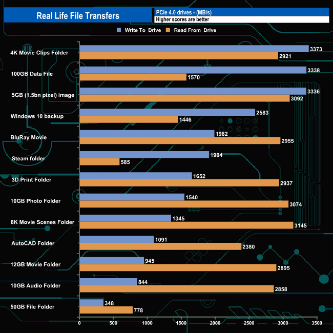 The drive averaged 1,867MB/s when writing the 14 transfer tests, with the fastest being the 4K Movie Clips folder transfer at 3,373MB/s with the 50GB File folder the slowest at 348MB/s. Reading back the data the drive averaged 2,356MB/s, this time around it was the 8K Movie Scenes folder that was the fastest at 3,373MB/s. The slowest was the Steam folder transfer at 585MB/s.