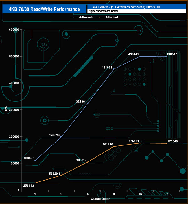 We used CrystalDiskMark 8’s custom settings to test the 4K 70/30 mixed read/write performance of the drive through a range of queue depths using a single thread and four threads.