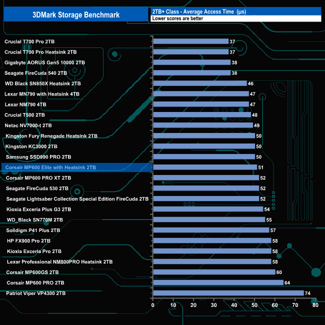 The average bandwidth figure for the drive was 598.43MB/s, a score that sees the Corsair MP600 Elite with Heatsink positioned in mid-table.