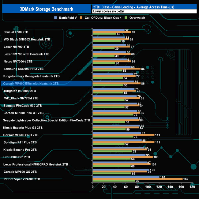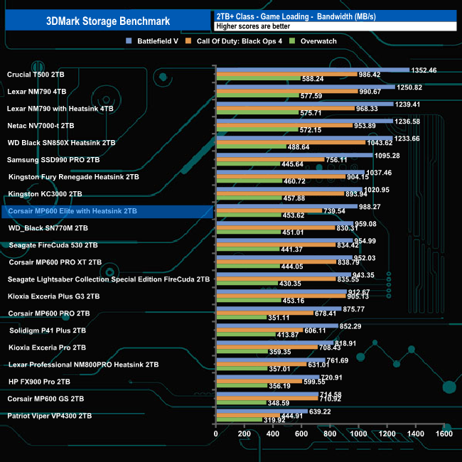 In 3DMark's Storage Benchmark Game Loading test, the MP600 Elite with Heatsink averaged 727.14MB/s for the three-game loading tests with an average time of 72 µs.