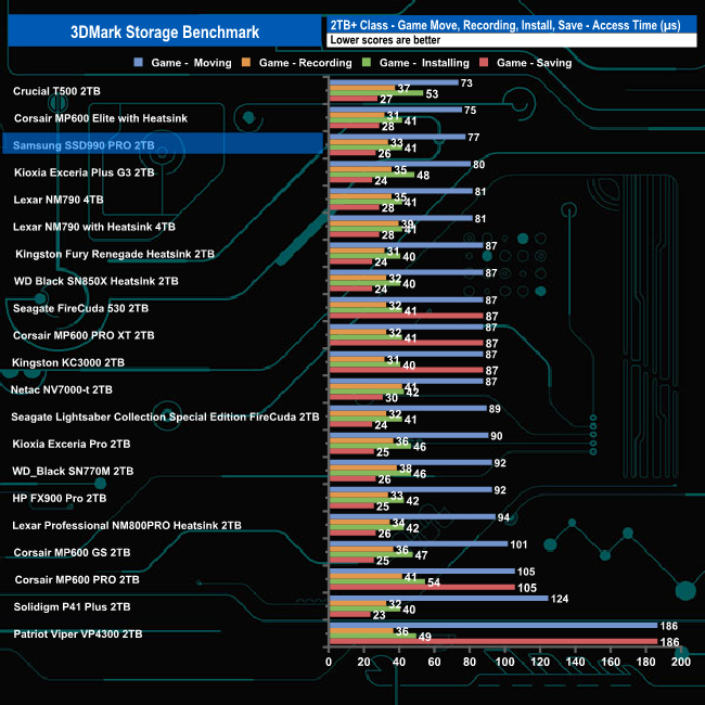 In the game moving, recording, installing and saving test traces the drive averaged 1,100MB/s with an average access time of 44.2µs for the four tests.