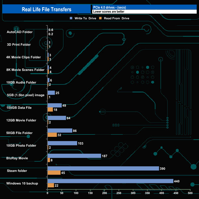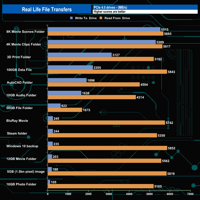 The drive averaged 1,654MB/s when writing the 13 transfer tests, with the fastest being the 8K Movie Scenes folder at 5,515MB/s with the 10GB Photo folder the slowest at 105MB/s.Reading back the data the drive averaged 5,101MB/s, the faster transfer being the 100GB Data File at 5,843MB/s. This time the slowest transfer was the 50GB file folder at 1,675MB/s.