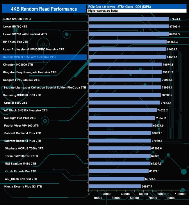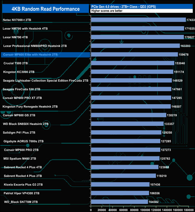 Although we couldn't get close to the official 4K random read figure, the MP600 Elite with Heatsink is still a quick drive, sitting in the top 10 for random reads at every tested queue depth.