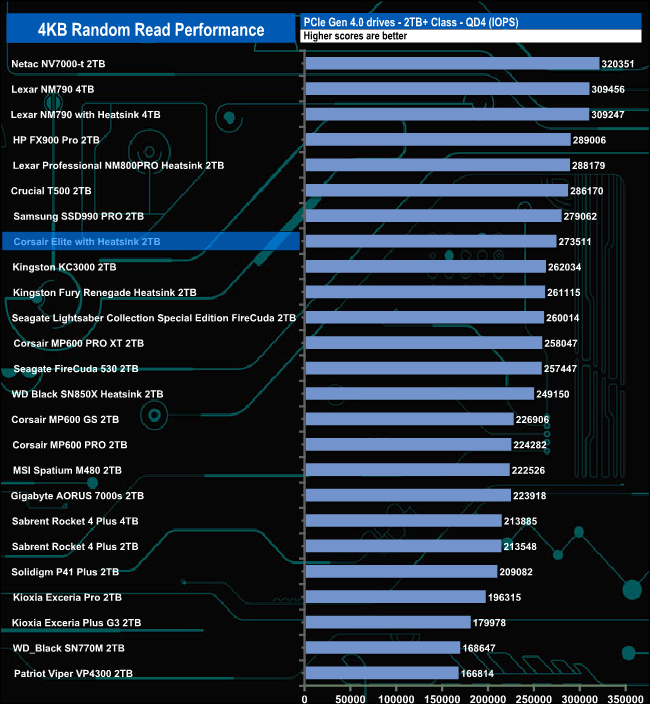 Officially the 2TB Corsair MP600 Elite with Heatsink is rated as up to 1,000,000 IOPS for 4K random reads. With our four-threaded tests, we couldn't get close to the official figure with a peak test result of 524,943 IOPS (2,150MB/s) at QD32.