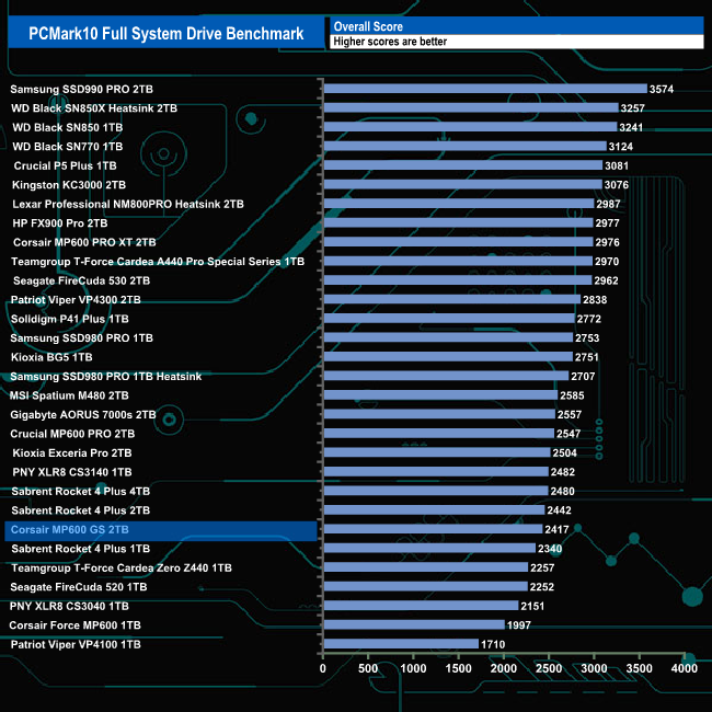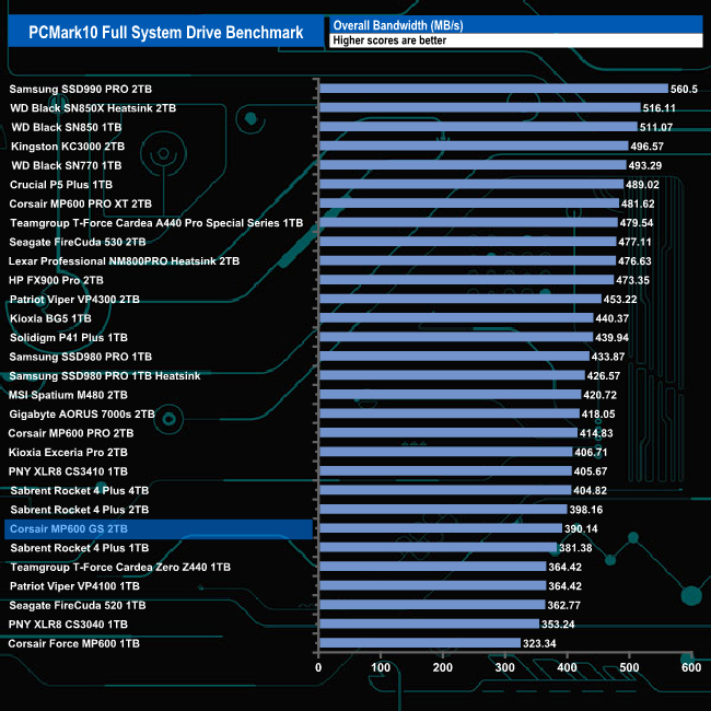 Corsair's MP600 GS dealt with the rigours of the PCMark10’s Full System Drive pretty well. The best result from the Creative set of test traces was the from the Heavy Use Adobe Photoshop trace at 881MB/s. It also handled the Adobe After Effects use test trace reasonably well with a test result of 390MB/s.