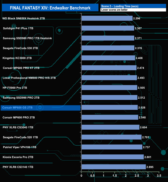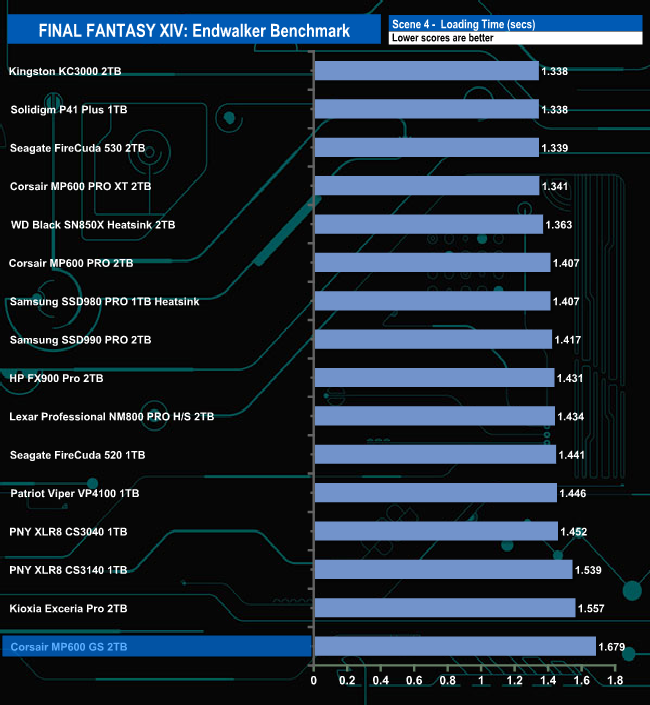 In the Final Fantasy XIV Endwalker Official Benchmark, the MP600 GS gives a total load time of 9.947 seconds. When it comes to the individual scenes the benchmark uses, the MP600 GS performs the best in the fifth and final scene with a load time of 0.716 seconds.