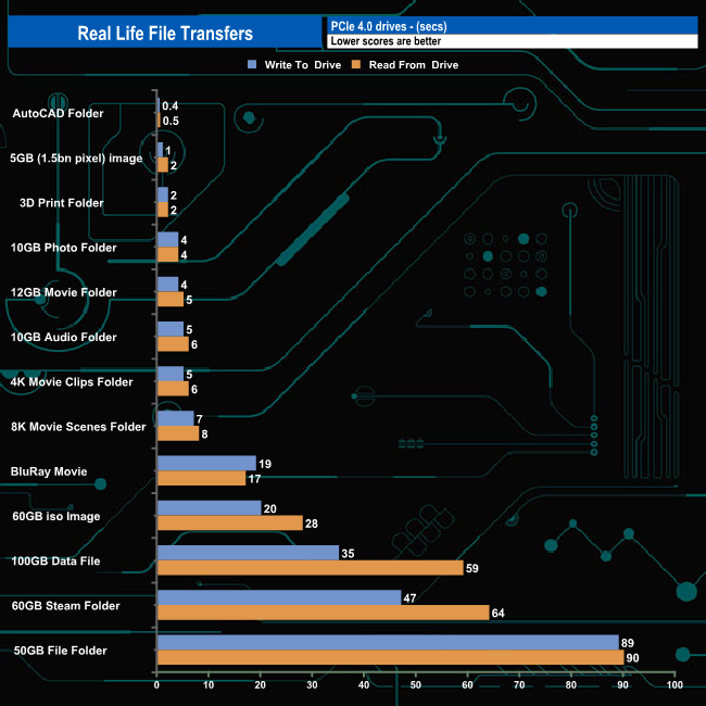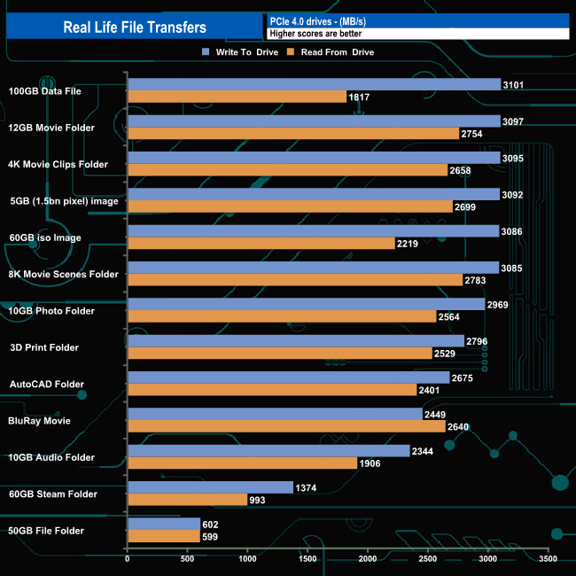 Writing to and reading from an NVMe drive saw transfer speeds rocket and overall transfer times dropped dramatically as you might expect. Six of the transfers topped over 3GB/s when writing to the drive. Of the remaining seven tests, five topped 2GB/s. Fastest write speed came from the 100GB data file at 3,101MB/s while the slowest was, as usual, the 50GB file folder at 602MB/s. While the 100GB data file gave the fastest write speed, the drive did seem to have a bit of a struggle when reading the data back.