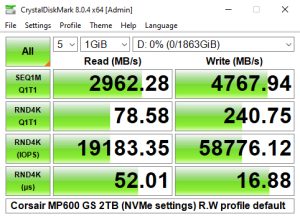 Corsair rate the Sequential performance of the 2TB MP600 GS as up to 4,800MB/s for reads and up to 4,500MB/s for writes. Using the default CrystalDiskMark 8 test we could not only confirm those figures but we coaxed a bit more out of the drive with test results of 4,981MB/s for reads and 4,794MB/s for writes.