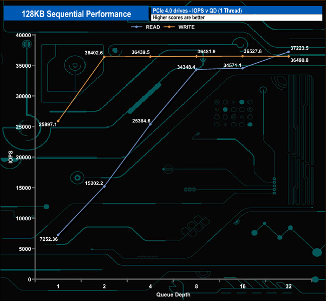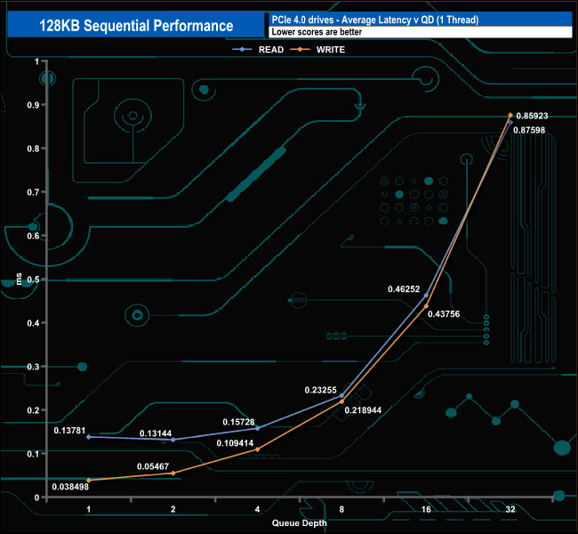 We used CrystalDiskMark 8‘s custom settings to test the Sequential read and write performance of the drive through a range of queue depths. The setup for the tests is listed below.