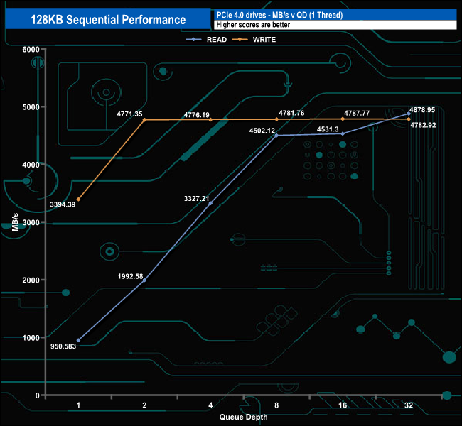 In this Sequential test, we could confirm the official read rating of up to 4,800MB/s with a test result of 4,878.95MB/s. When it came to Sequential writes we were able to pull a bit more performance out of the drive with a test result of 4,782.92MB/s, some 282MB/s faster than the official rating.